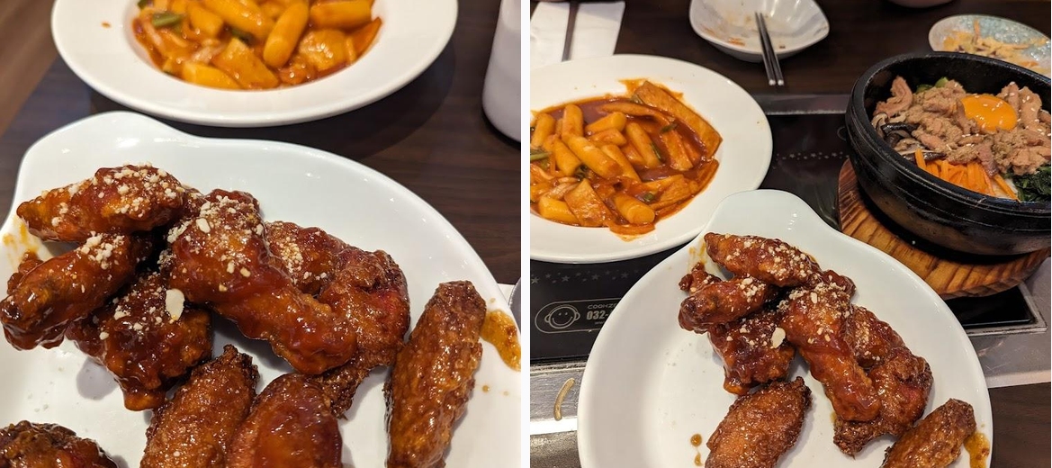 It was such a hot day today, but the cold noodles just hit the spot for me. It was so delicious and refreshing! The fried chicken wings are crispy and the spicy sauce on it is just the right amount of sweetness and spiciness. Spicy pork bibimbap is tasty too. Price is also reasonable.